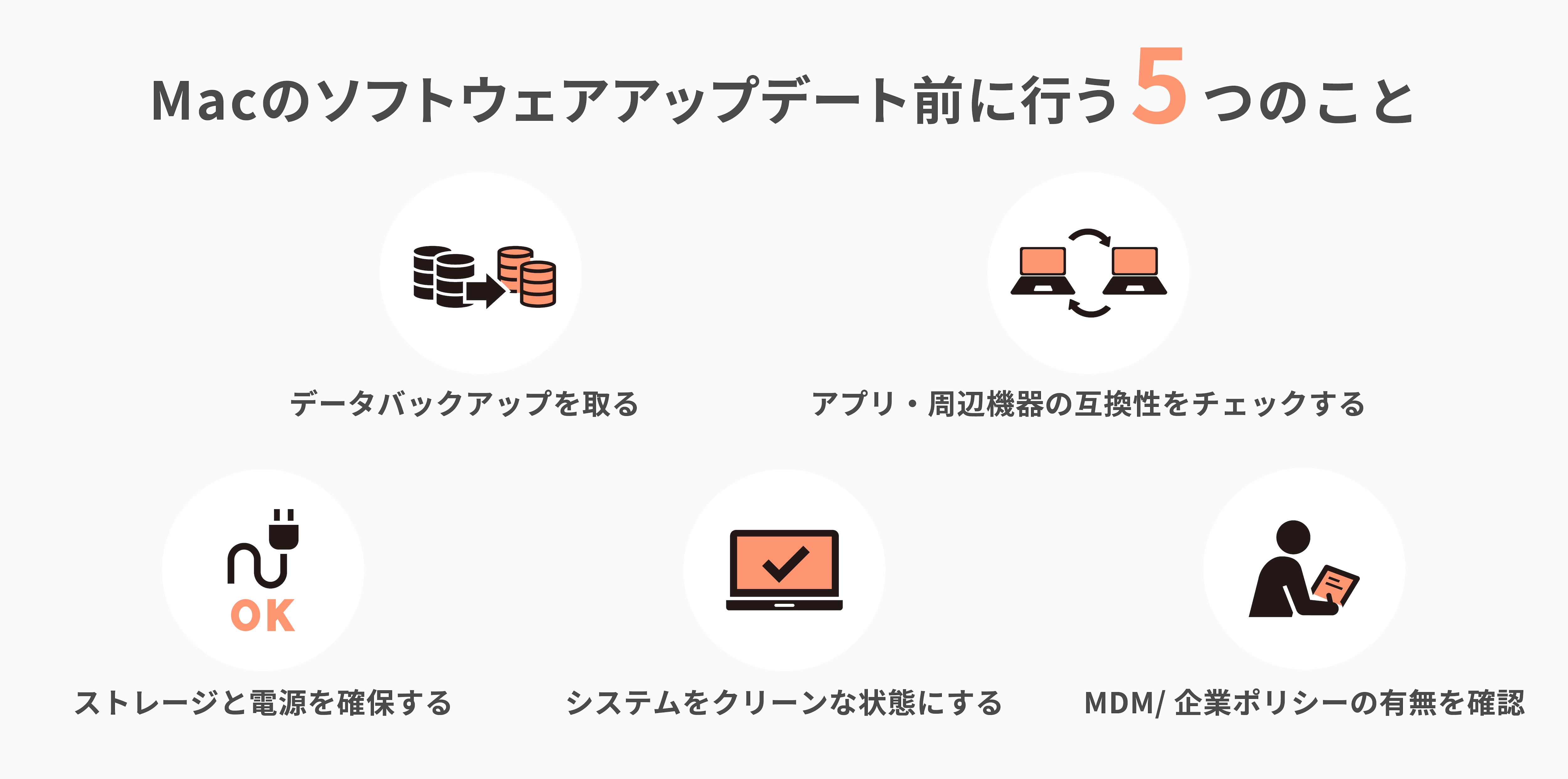 macOSをアップデートする前に、しっかりと準備をしておくことが重要です。 アップデート作業中に万一のトラブルが起きても被害を最小限に抑え、スムーズに新OSへ移行するための事前チェックリストを確認しましょう。